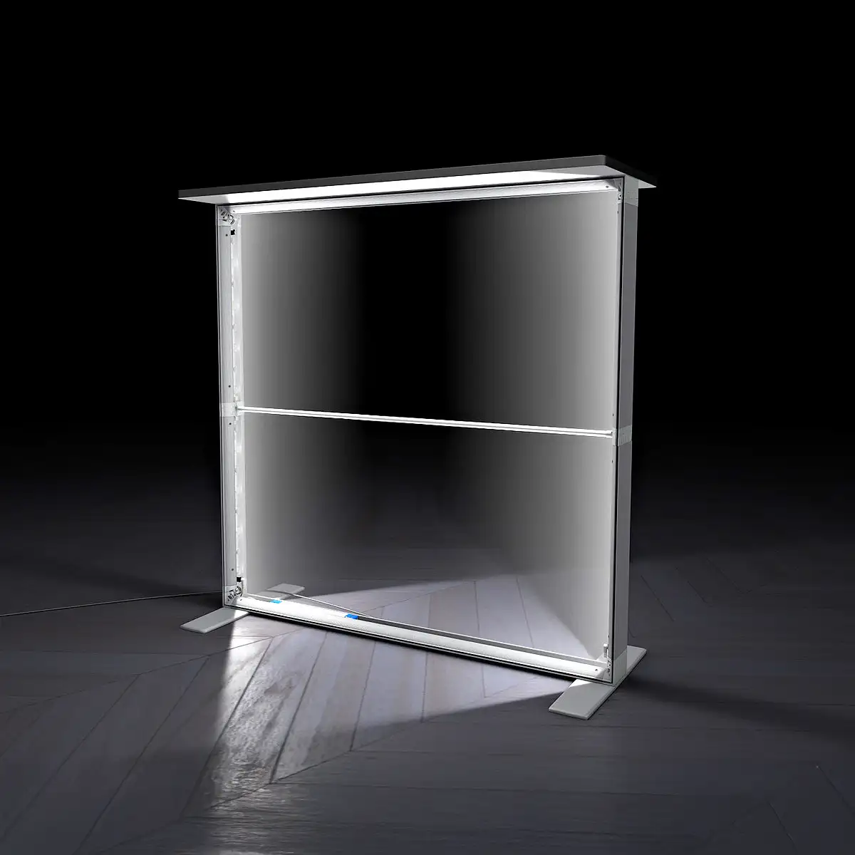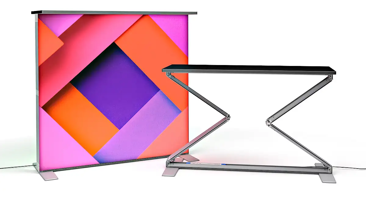 è un banco espositivo luminoso innovativo, progettato per essere montato in pochi secondi. Si tratta di un counter pieghevole retroilluminato con tessuto tensionato, ideale per fiere, eventi ed esposizioni professionali