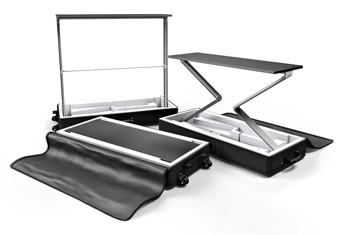 Il DESK Pop-Up LED è un banco LED autoportante e pieghevole che si apre semplicemente sollevandolo dalla borsa.