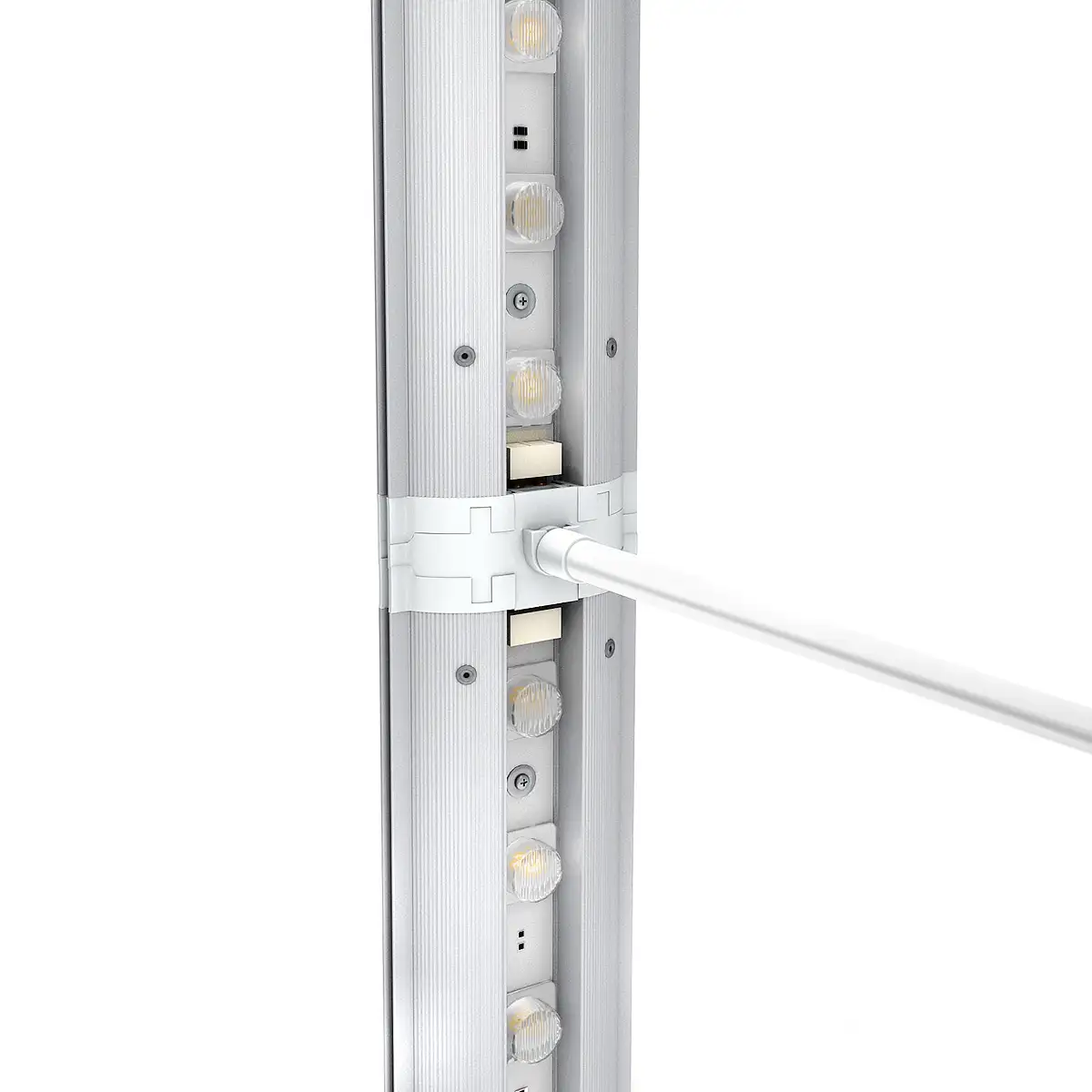 Il telaio pieghevole è realizzato in alluminio leggero ed è dotato di canalizzazioni integrate per sistema TFS (Tension Fabric System), progettate per ospitare e valorizzare grafiche in tessuto retroilluminato.