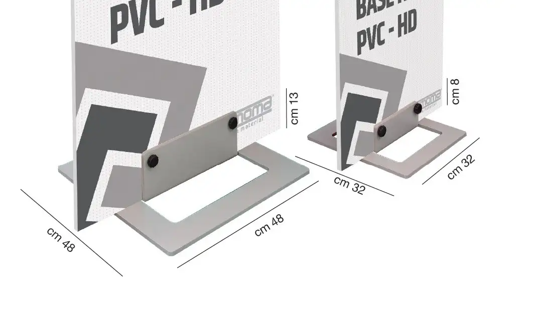 Totem con base pesante in ferro verniciata a fuoco da 12,5 Kg. e pannello in sandwich da 20 mm. di spessore con stampa fronte e retro. Su misura