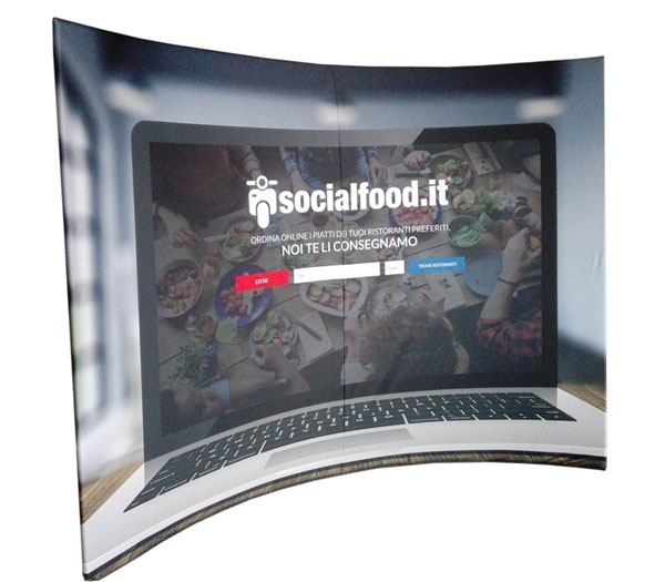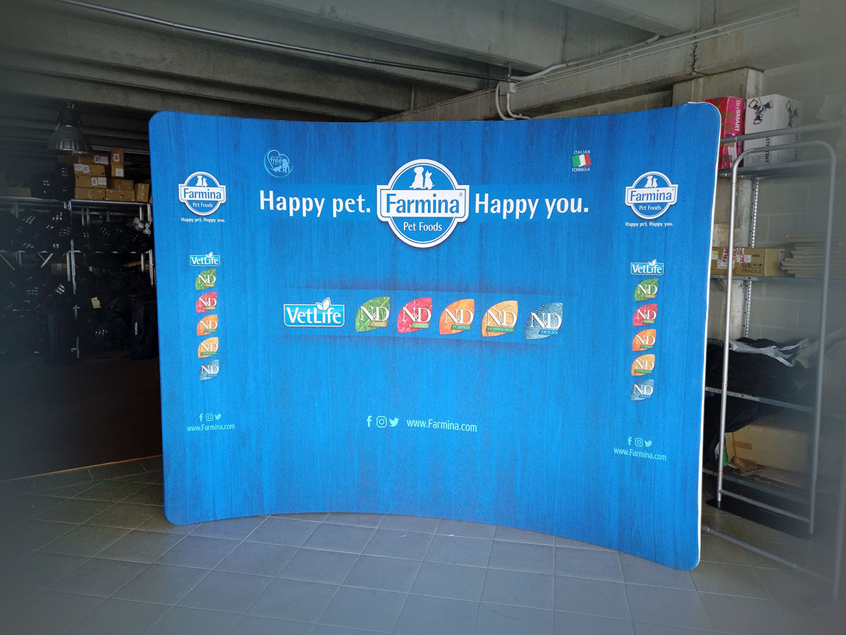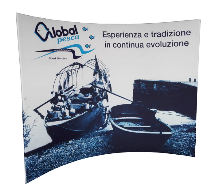 La stampa personalizzata del nostro Wide Fabric curvo viene realizzata interamente nel nostro reparto stampa interno, per garantire controllo totale sulla qualità. La grafica è stampata in un unico telo senza cuciture a vista su tessuto elasticizzato anti-grinza, così da ottenere una superficie perfettamente liscia durante l’esposizione.