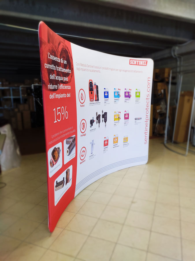 Il risultato è un fondale espositivo perfettamente teso e professionale, pronto per fiere, showroom ed eventi.